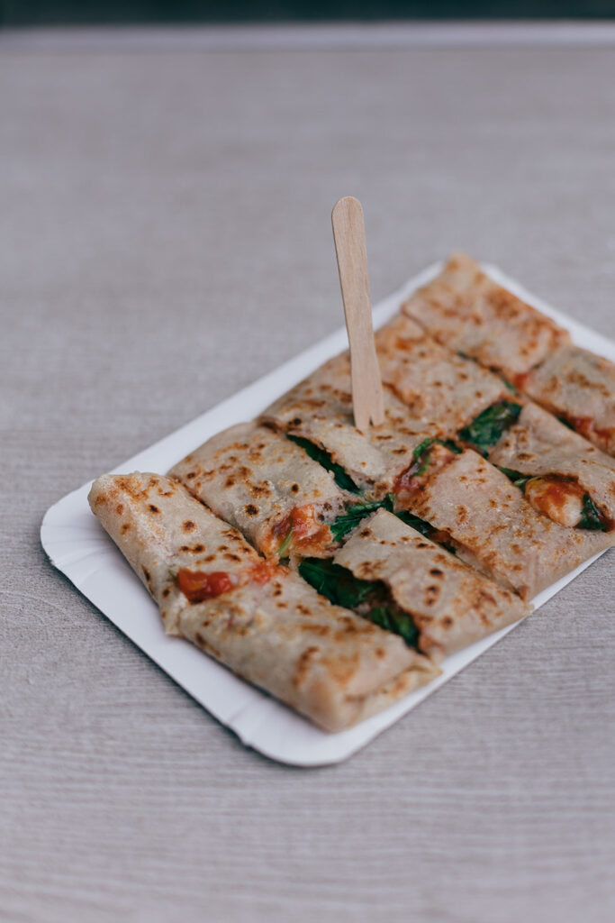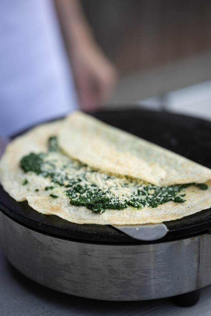 Wir bereiten unsere Crêpes stets frisch vor den Augen der Gäste zu. «Live-Cooking» sozusagen. Dazu schneiden wir die Crêpes gleich in mundgerechte Stücke für den perfekten «Finger Food». Das heisst, dass wir dafür aber etwas Zeit benötigen.